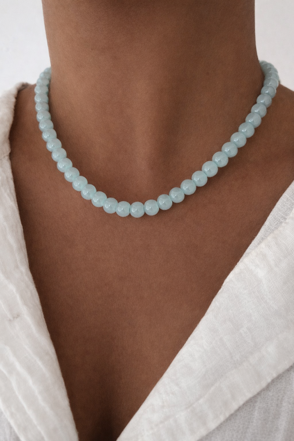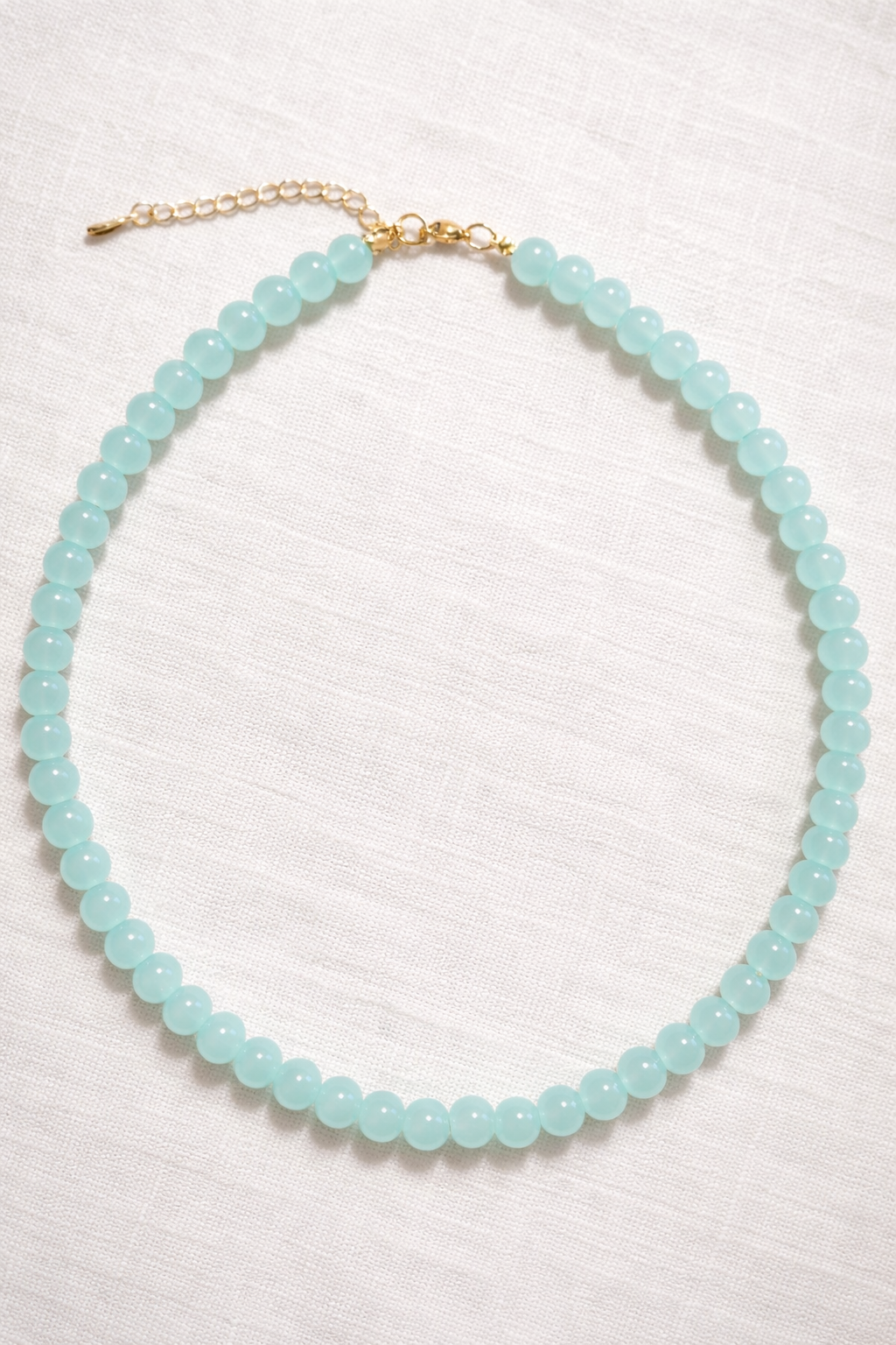 Soft blue glass beads inspired by ocean skies. Lightweight and adjustable with a stainless steel extension chain.