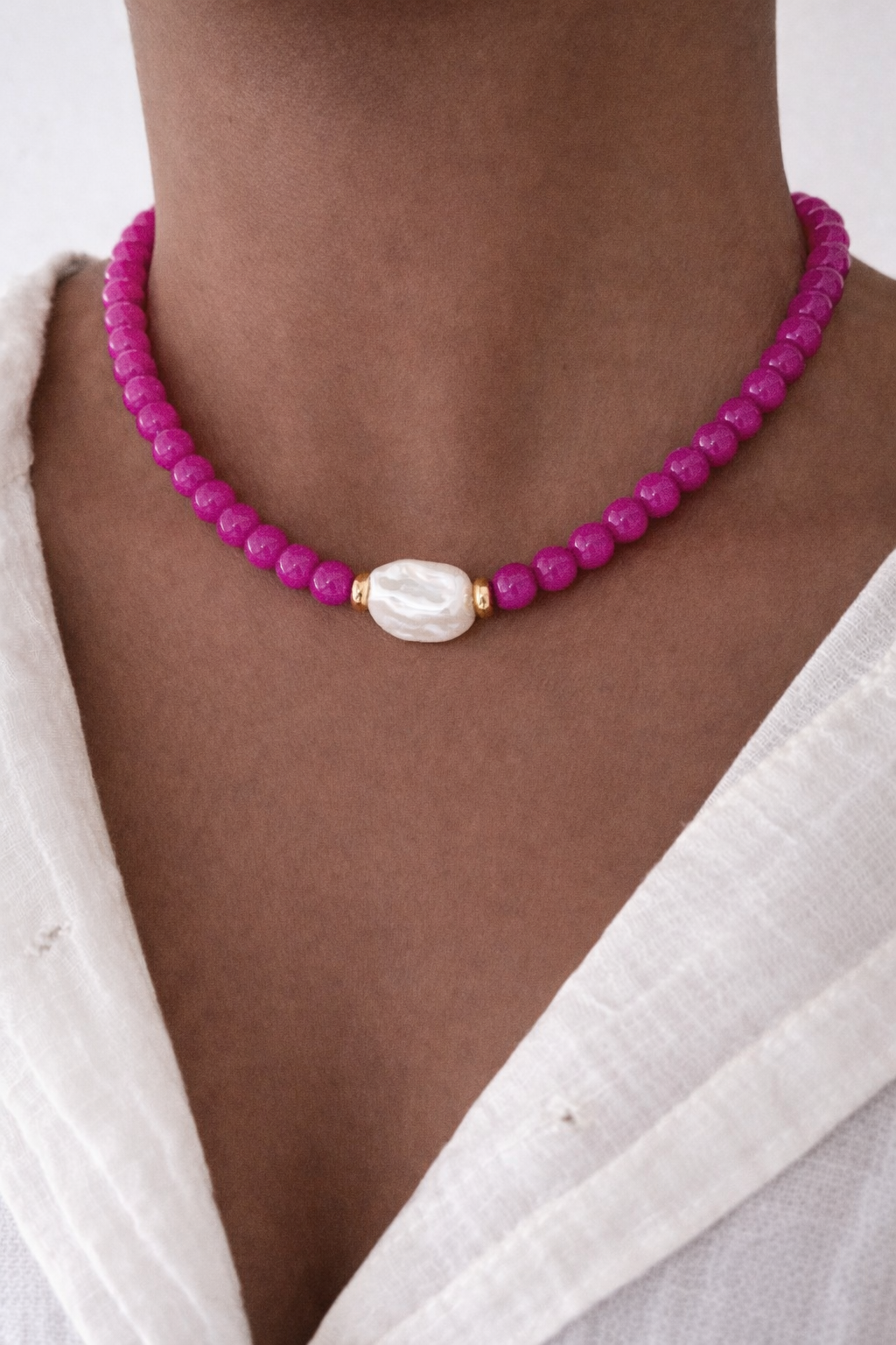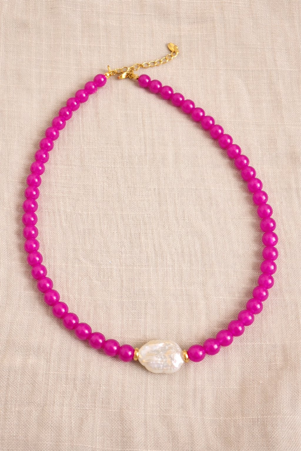 Bright pink glass beads paired with a delicate freshwater pearl for a fresh summer feel. Adjustable with a stainless steel extension chain.