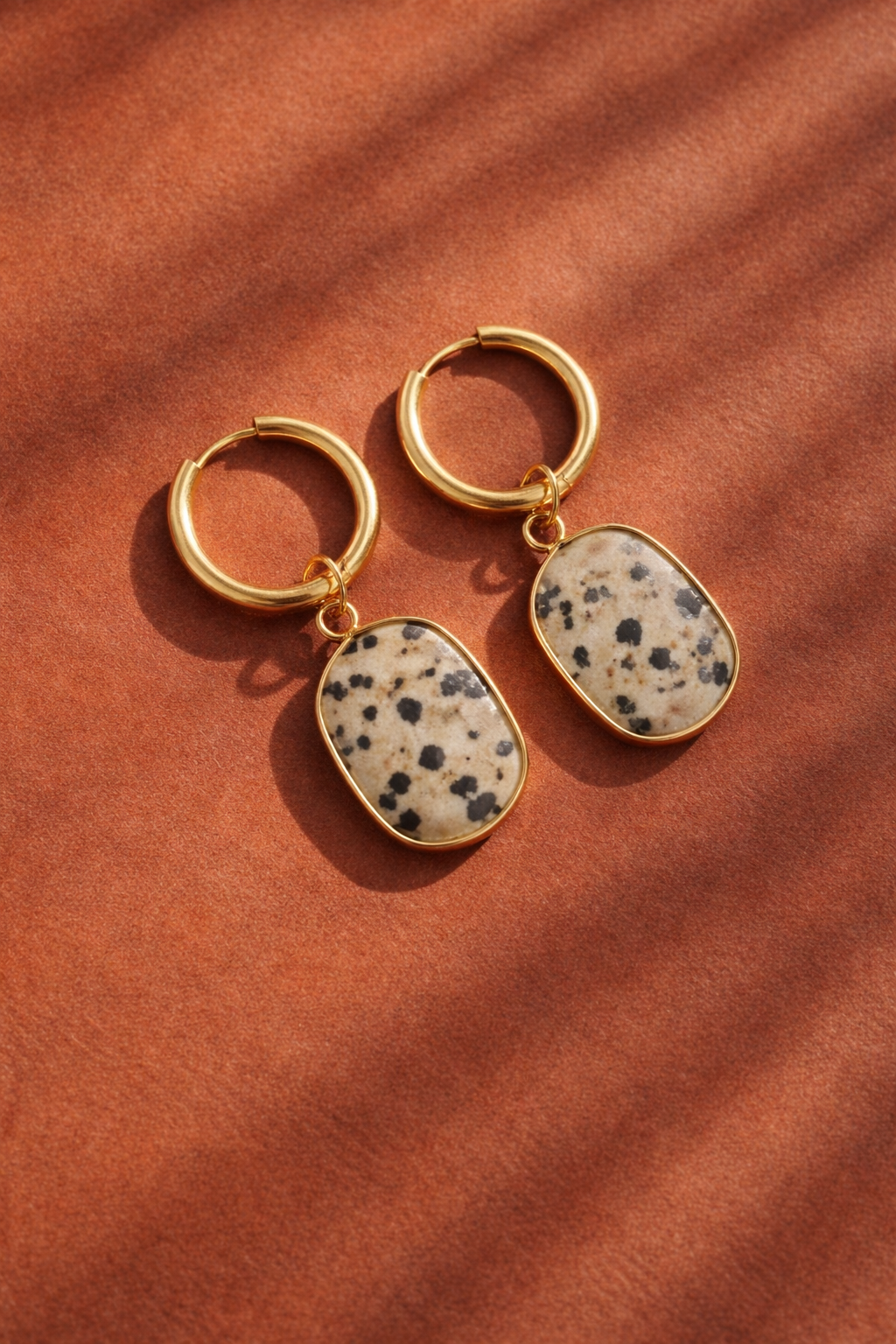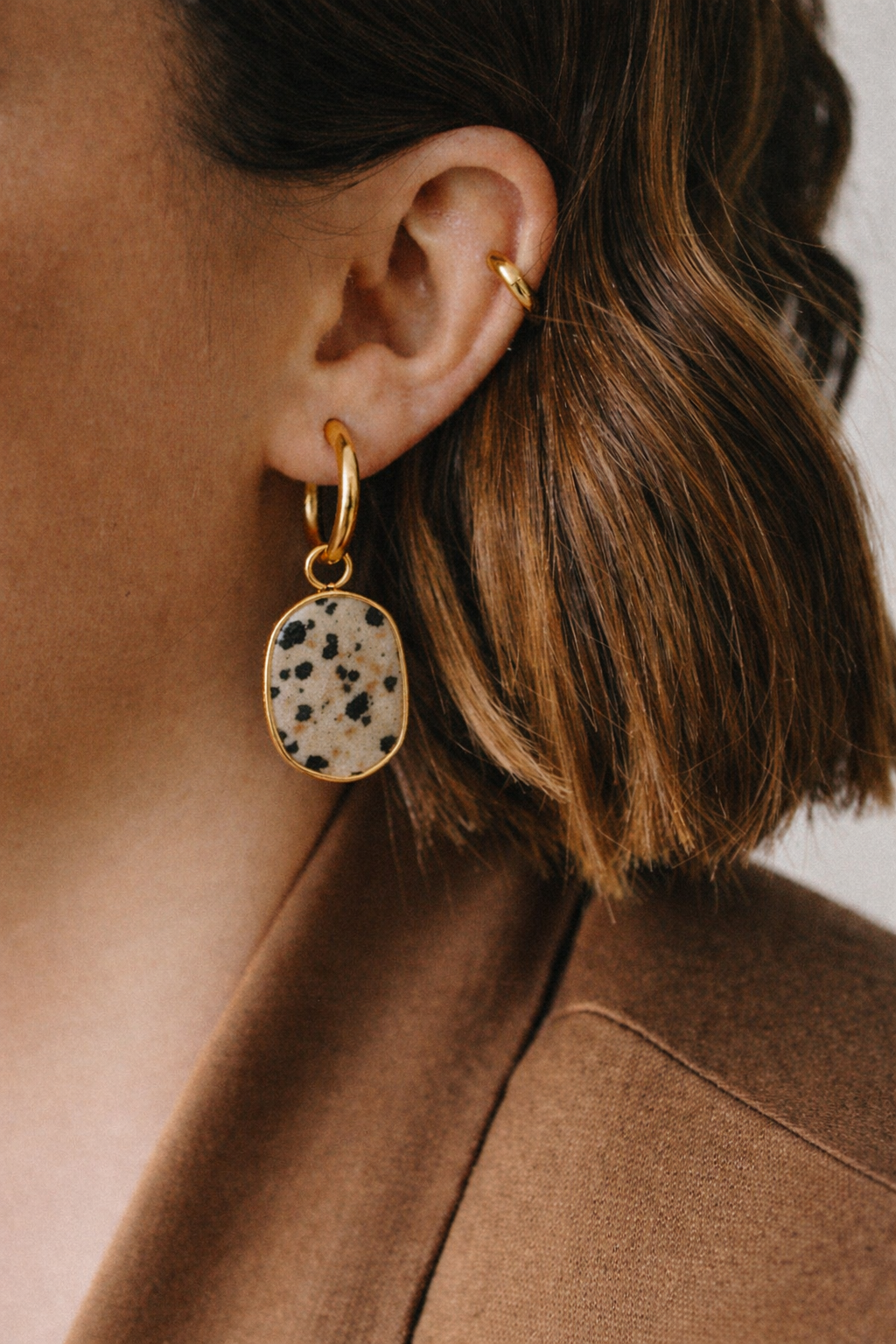 The charm is removable — wear her as a statement stone or as a simple golden hoop, depending on the mood.