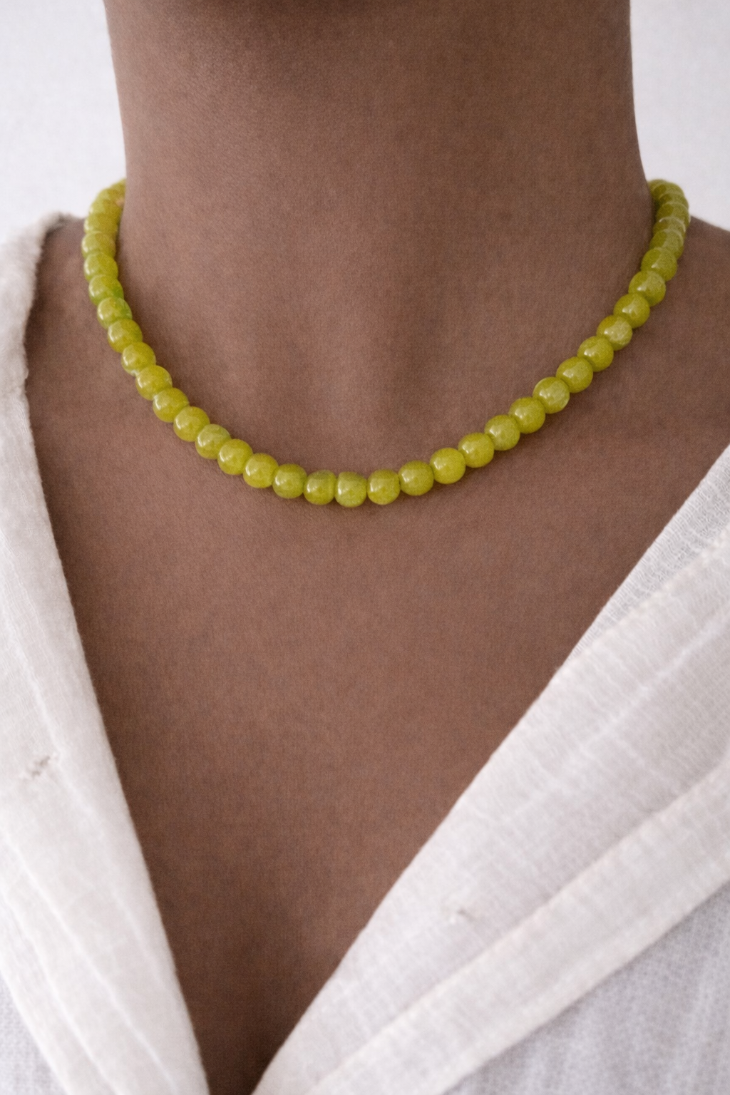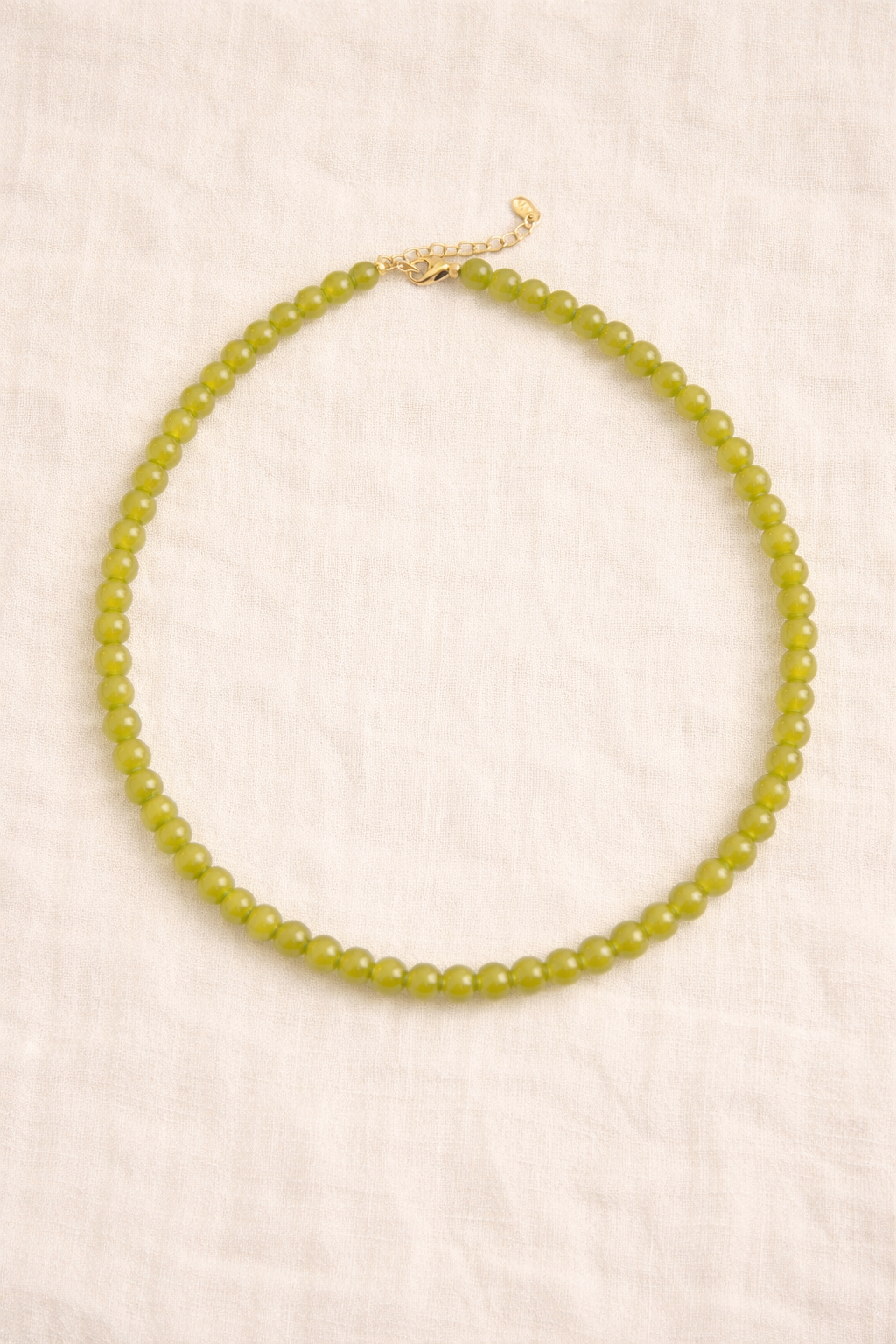 Fresh green glass beads inspired by Mediterranean summers. Lightweight with an adjustable stainless steel extension chain.