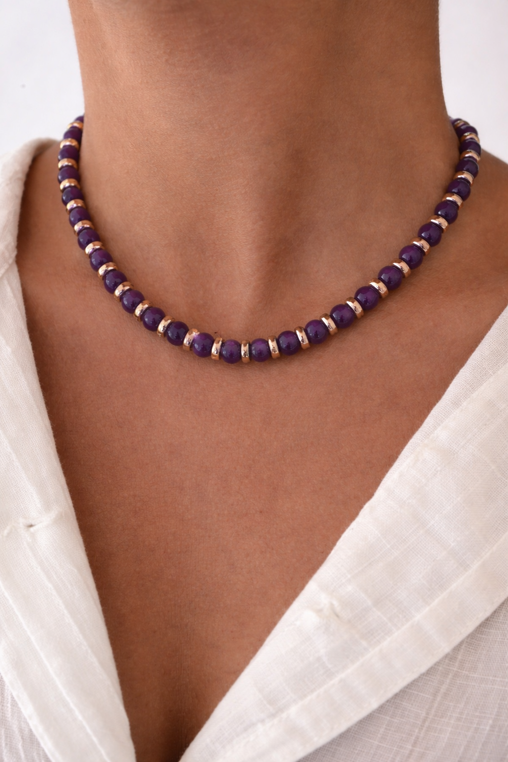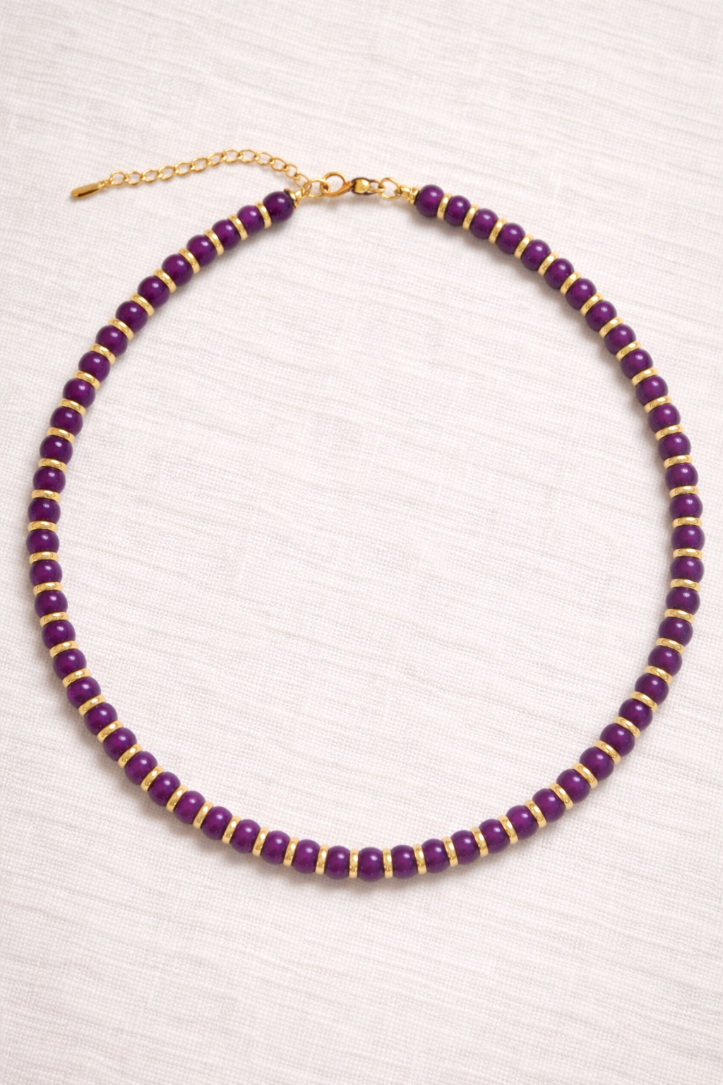 Deep violet glass beads with subtle golden accents for an elegant pop of colour. Adjustable with a stainless steel extension chain.