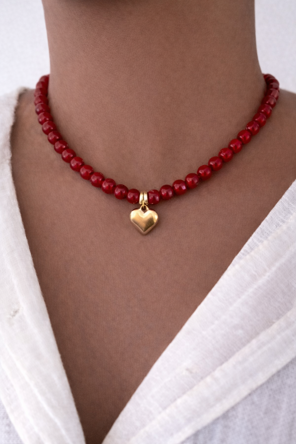 Classic red glass beads with a bold yet timeless feel. Finished with an adjustable stainless steel extension chain.